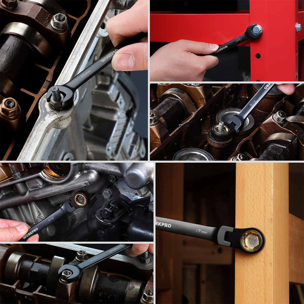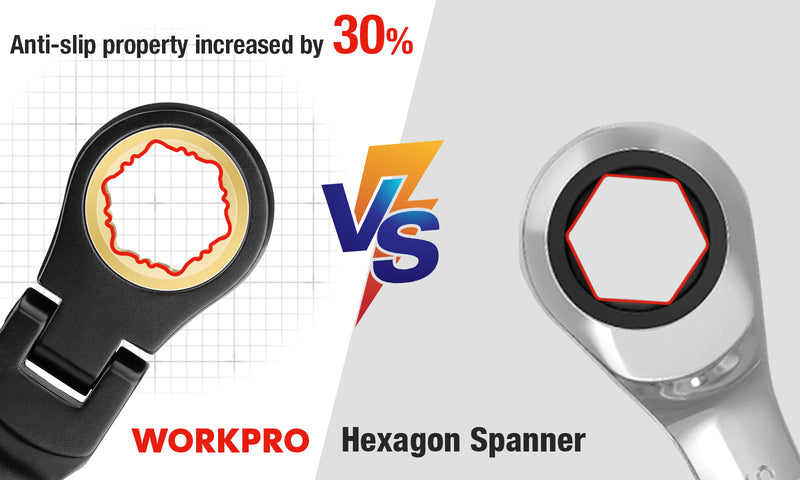 The WORKPRO ratchet wrenches feature a specially designed anti-slip tooth that increases grip by 30% compared to standard hexagon spanners. This enhancement ensures a secure hold on fasteners, even when they are worn or rounded, preventing slipping and providing superior control during use.