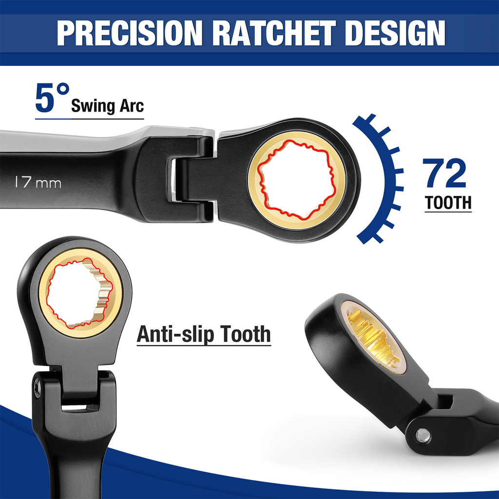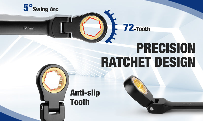 The ratchet mechanism features a 72-tooth design with a 5° swing arc, allowing you to work in tight spaces with minimal effort. This precise movement lets you easily engage fasteners in confined areas, increasing your efficiency and reducing the time spent on each task.