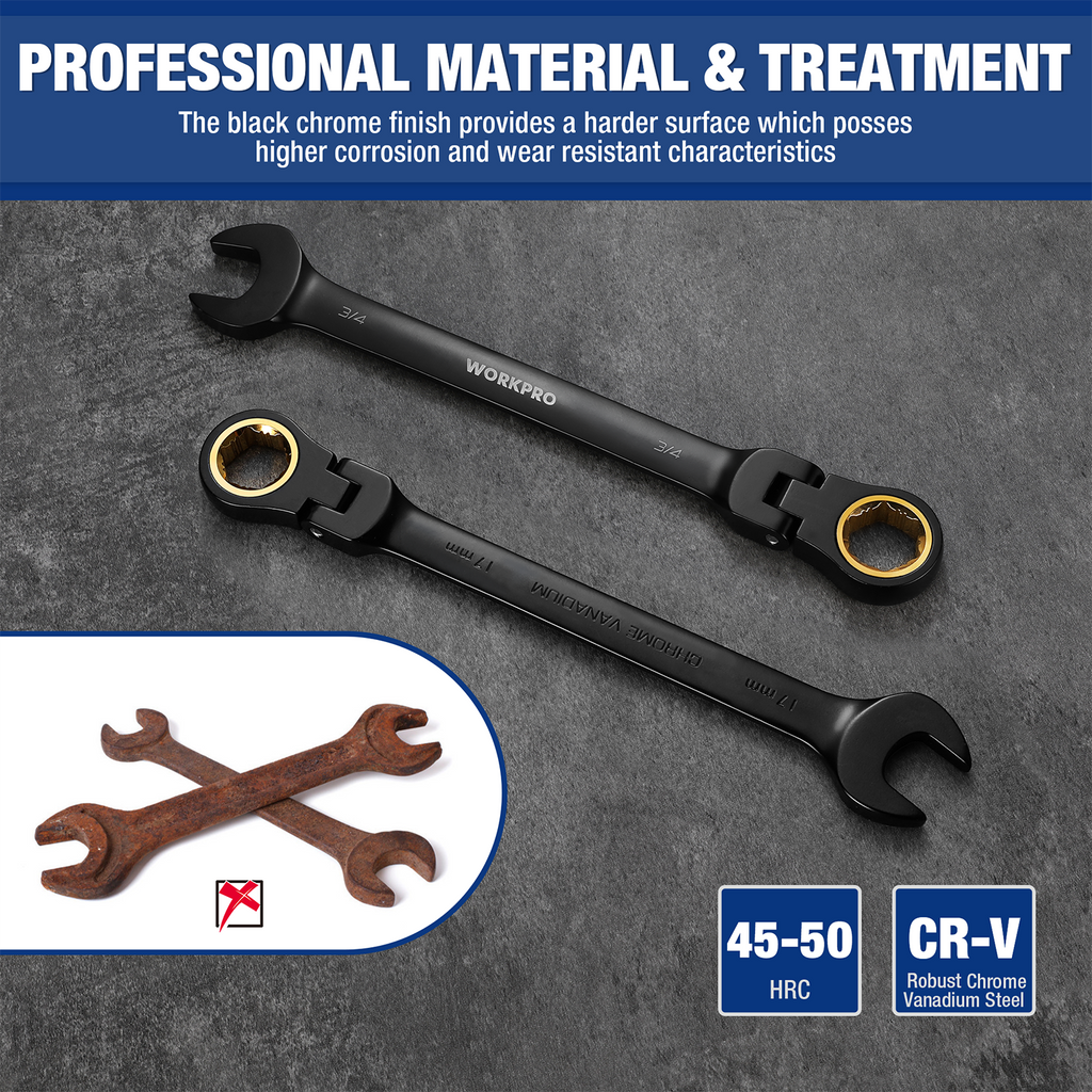 WORKPRO 22-piece Regular/Flex-head Ratcheting Wrench Set Anti-Slip Tooth with Organizer Box, Metric 6-18mm & SAE 1/4-3/4"