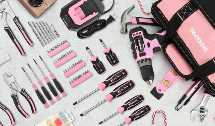 WORKPRO 12V Cordless Drill and Home Tool Kit with 14-inch Storage Bag - Pink Ribbon