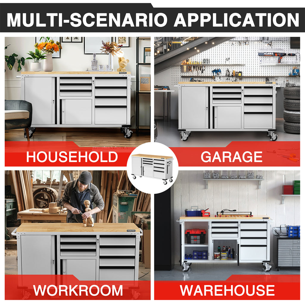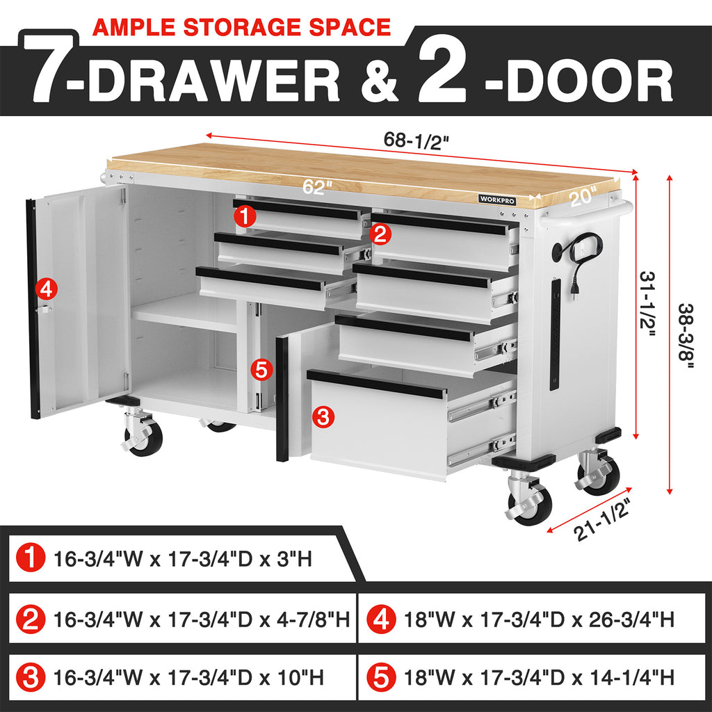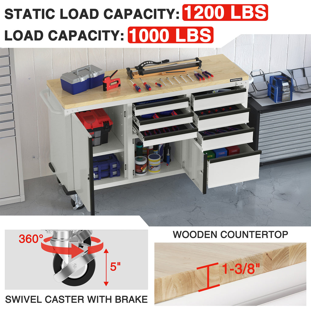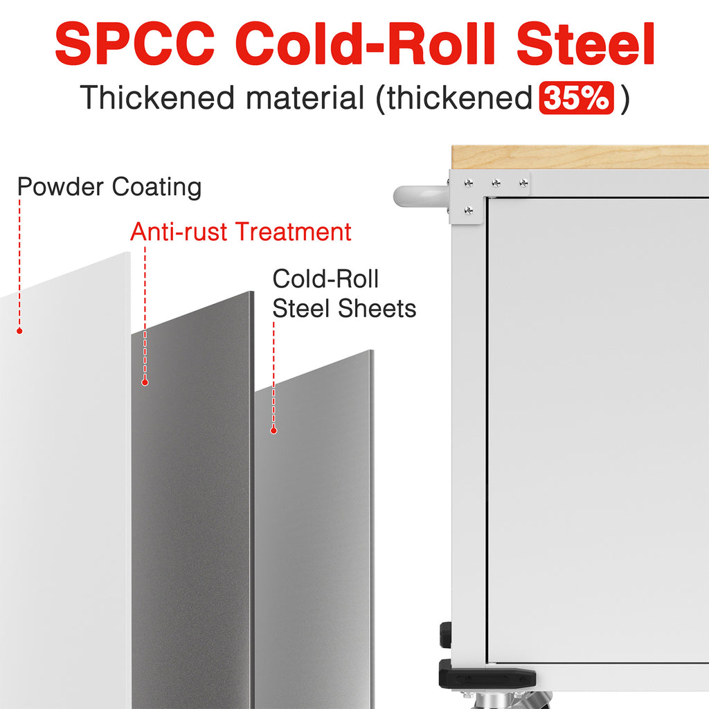 Built with thick steel panels and a powder-coated finish for durability and easy cleaning. The 1-3/8" solid wood work surface supports up to 1000 lbs for heavy tools and equipment.