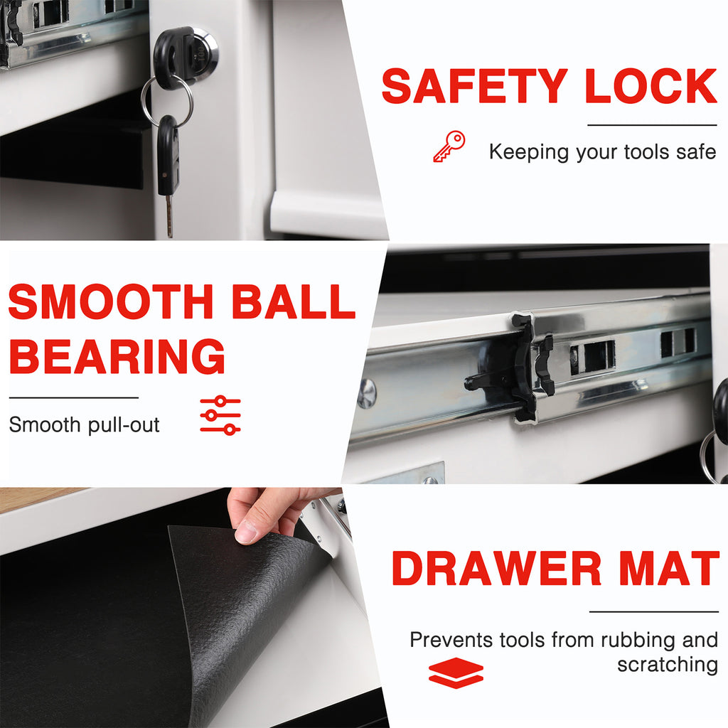 Includes drawers in multiple sizes with smooth ball-bearing slides and anti-slip liners. The left cabinet features adjustable shelves to organize tools of different sizes.