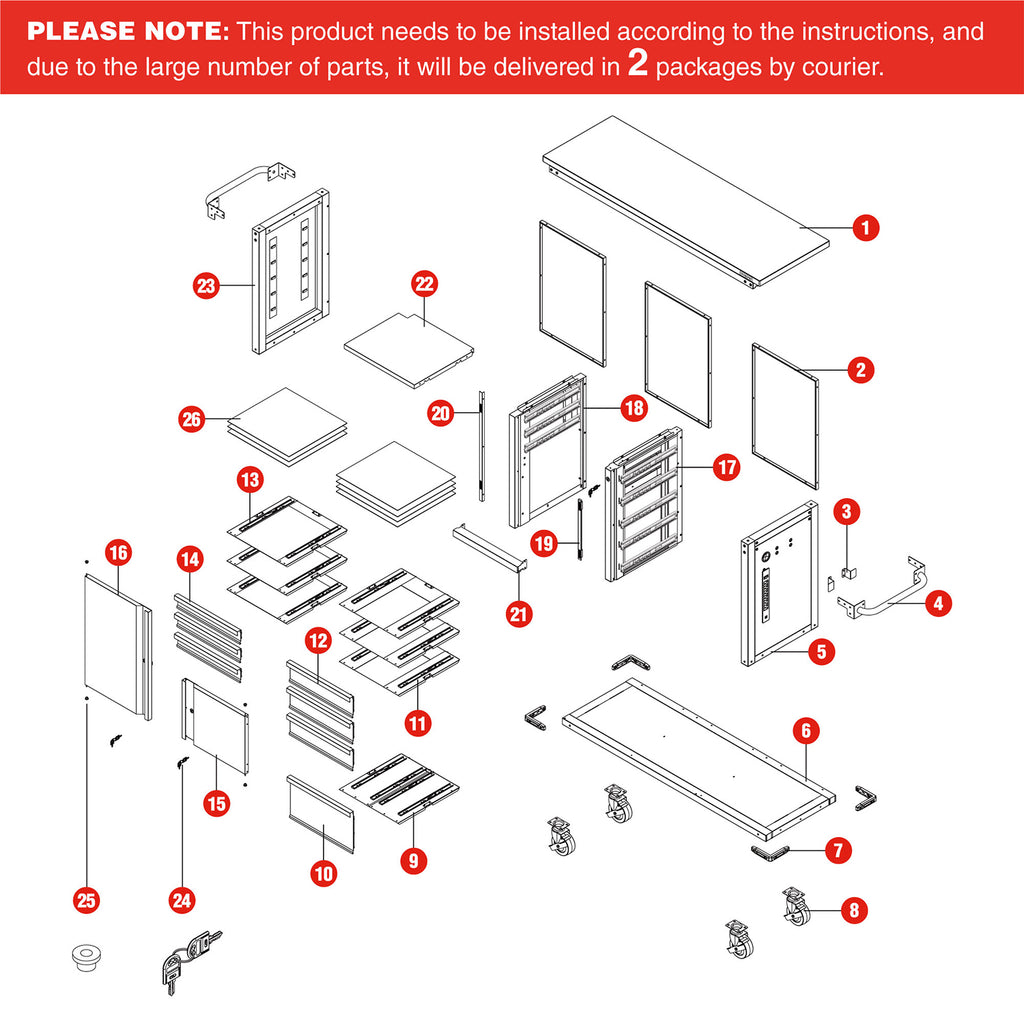 Central locking system with keys prevents drawers and doors from opening during movement. Corner bumpers help protect the cabinet from impacts.