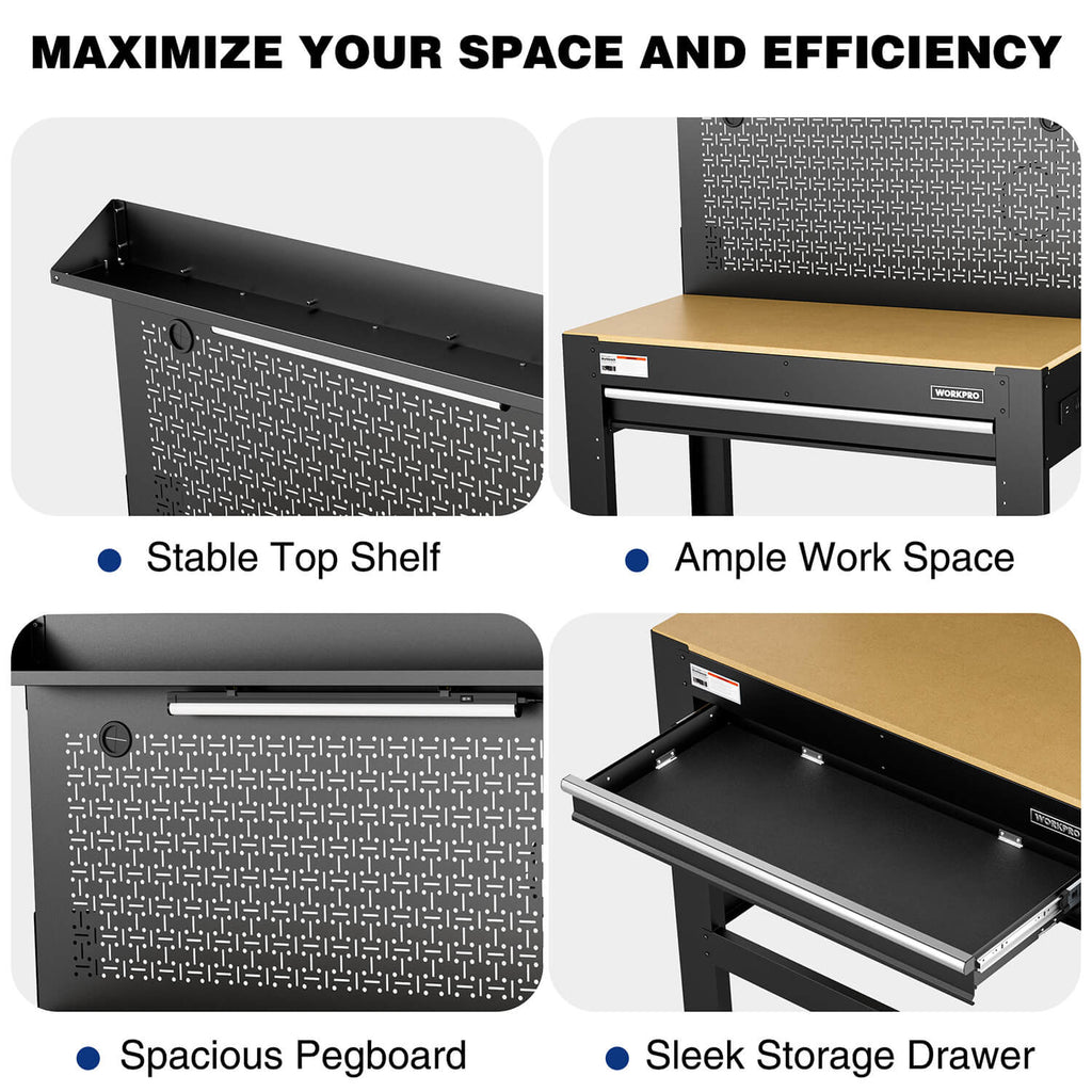 Experience the ultimate in workspace reliability with our garage workbench with storage, expertly crafted from robust Q195 cold-rolled steel. Its sturdy construction features two side panels, reinforced perimeter and center crossbars, and four robust uprights, ensuring exceptional durability for all your demanding tasks.